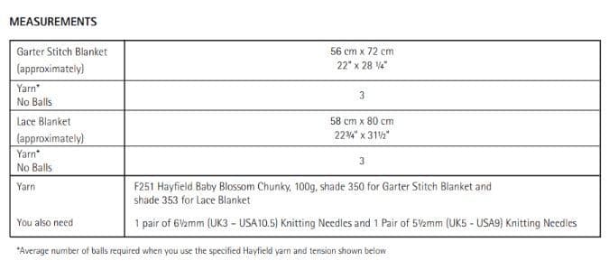 Hayfield Babies Blankets Knitting Pattern in Blossom Chunky as a PDF Download. Please see second image for yarn amounts required.
