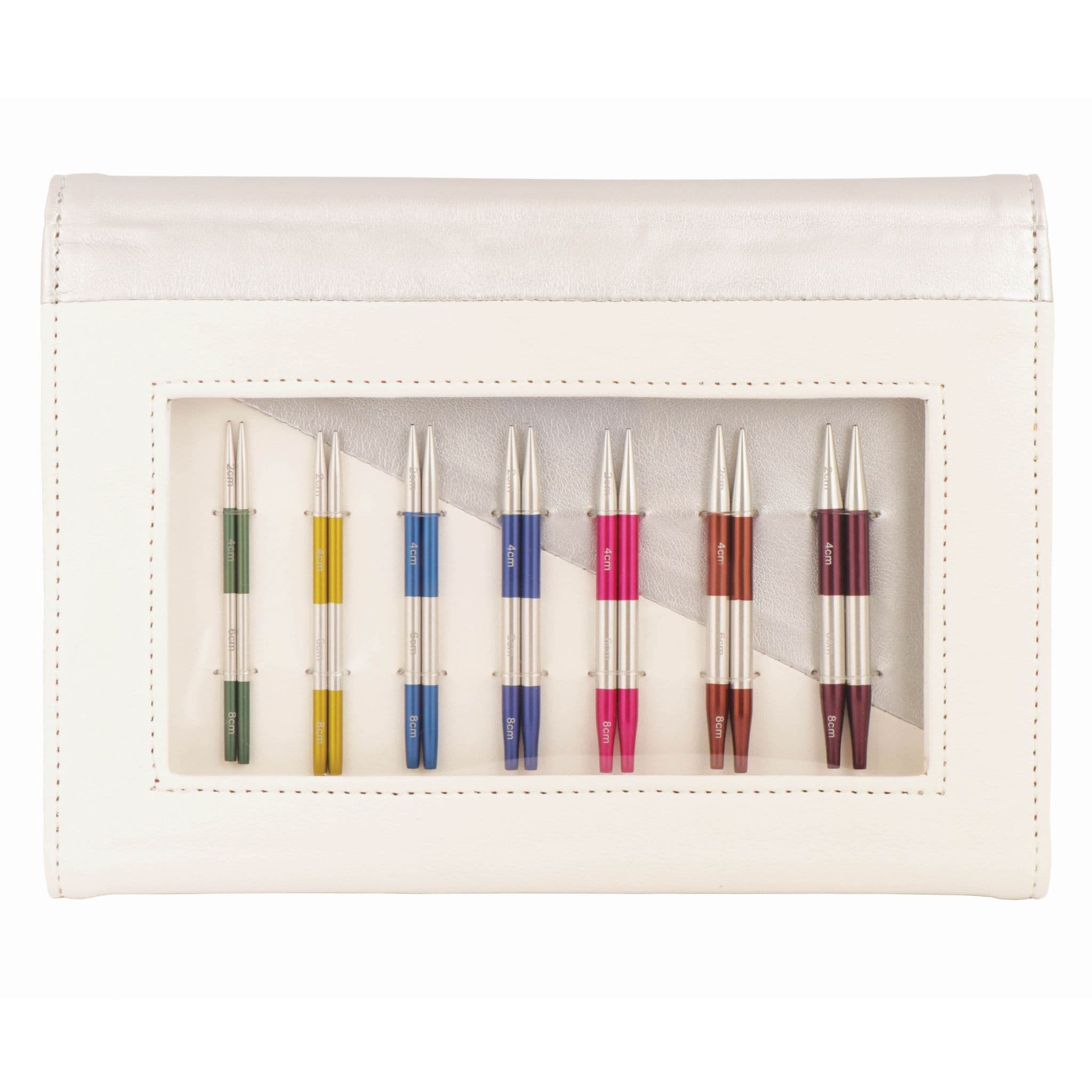 White and silver faux leather case containing 7 pairs of interchangeable knitting pin tips in all the popular sizes: (10cm x 3.00, 3.50, 4.00, 4.50, 5.00, 5.50 and 6.00mm). Vibrant, size specific colours. Lightweight, strong & durable needles. Perfect points, flawlessly tapered ? ideal for all yarns and every project. Set also includes 4 cables: 2 x 40cm and 2 x 50cm, 8 end caps, 4 cable keys and 1 set of cable connectors. Provides hours of pleasurable knitting with no hand fatigue. Laser printed sizes on all needles.